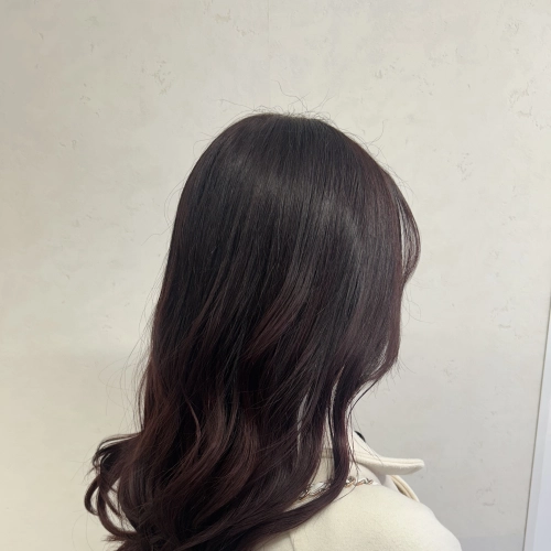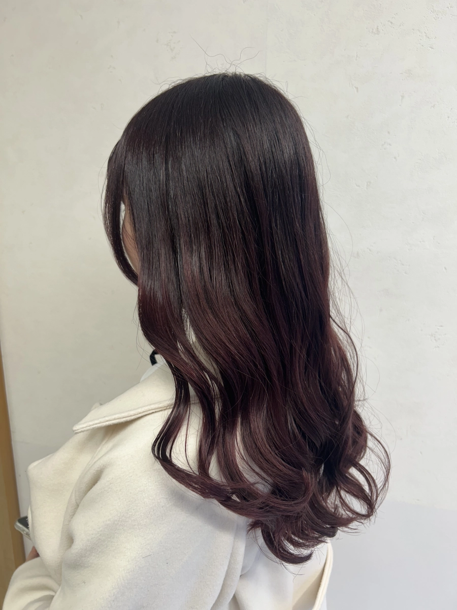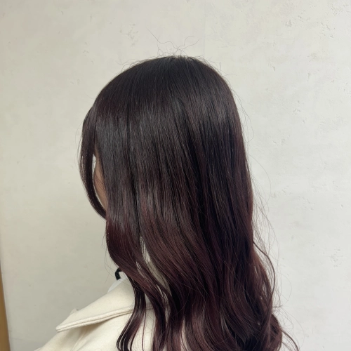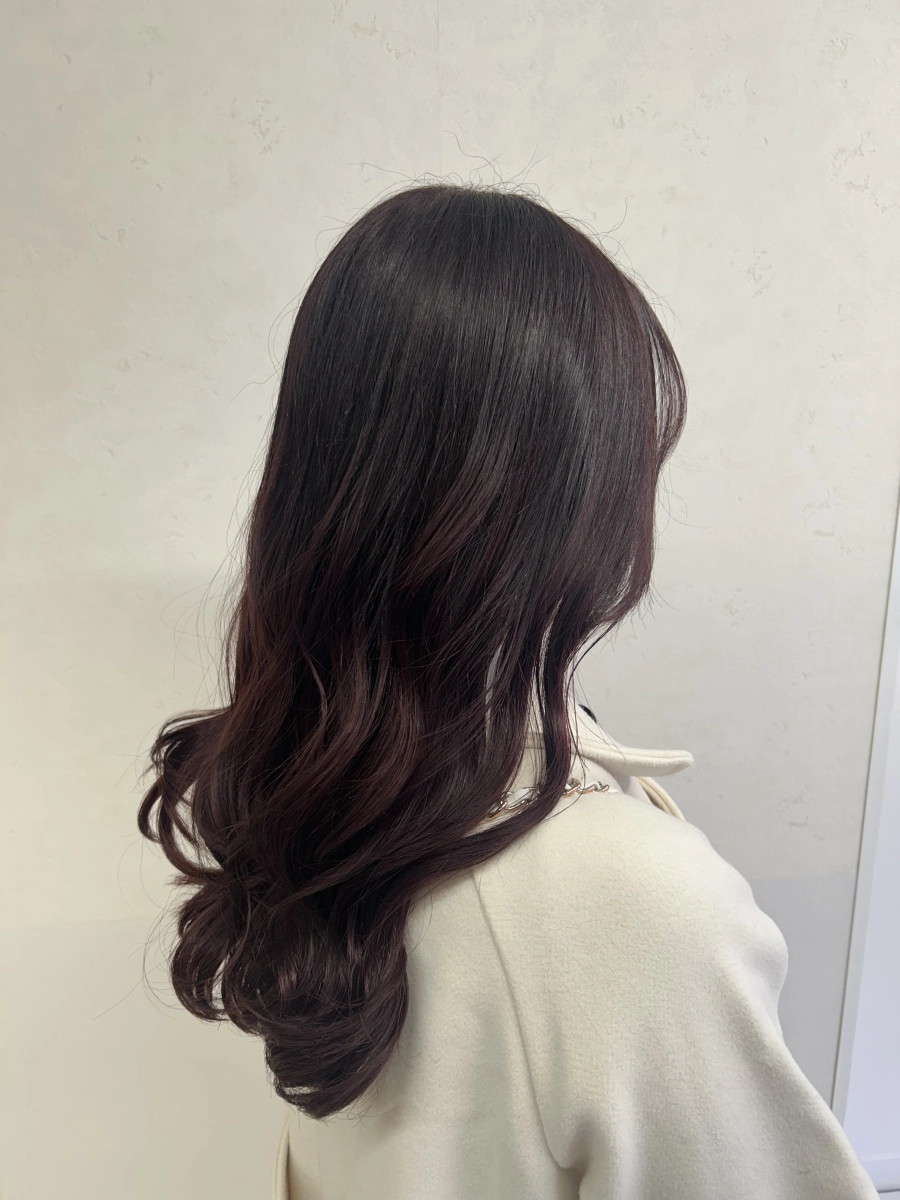深みのあるボルドーブラウンで、ツヤと可愛さを引き出した大人ロング。柔らかなウェーブで動きを出し、暗髪でも重く見えない上品で女性らしいスタイルに仕上げました。