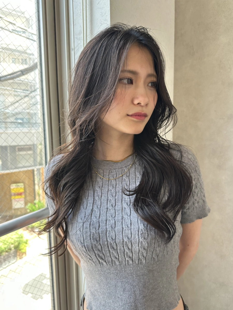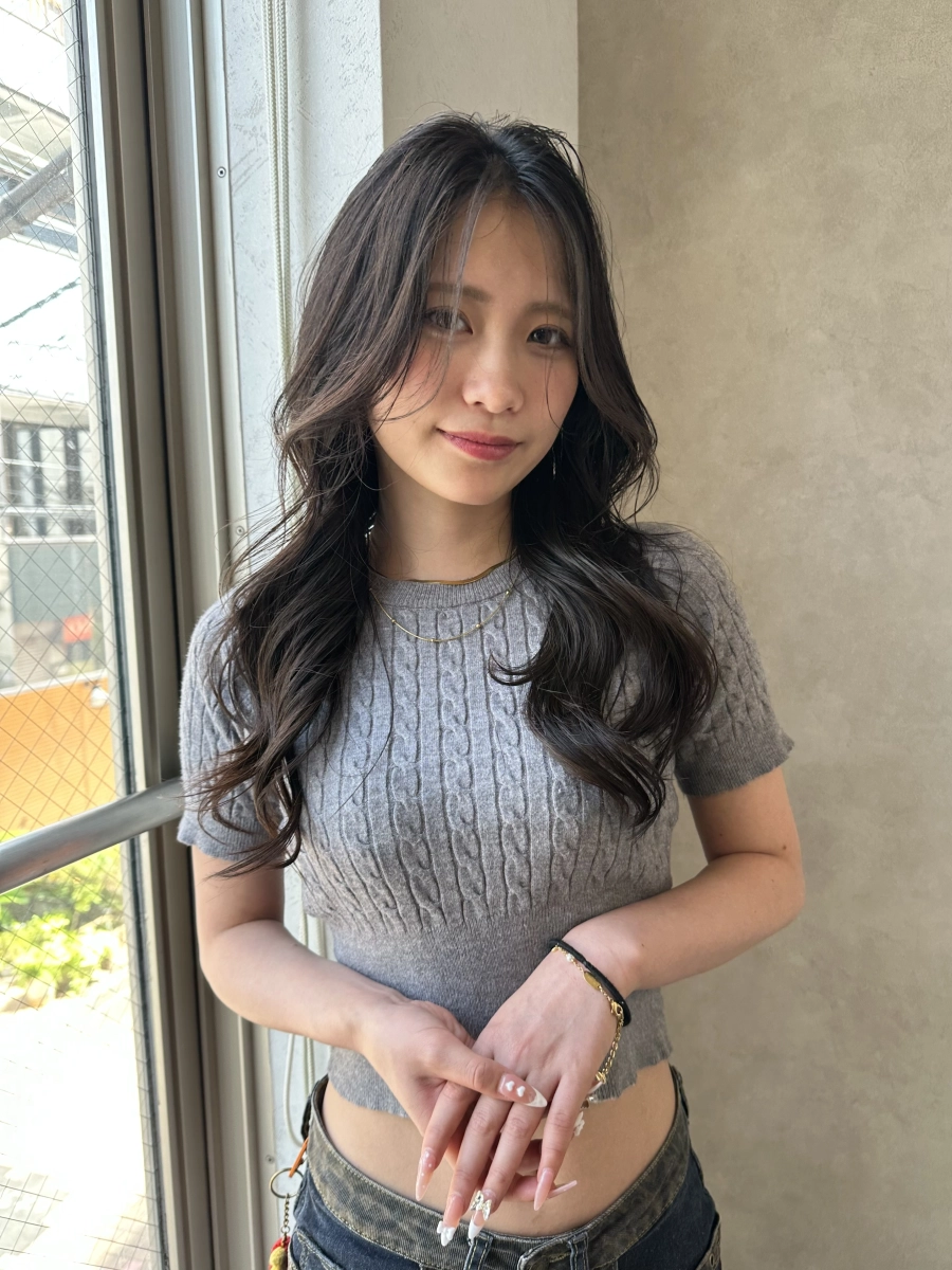 全体にレイヤーを入れてコテで巻きを入れることでくびれが出せて小顔に見える効果があります!