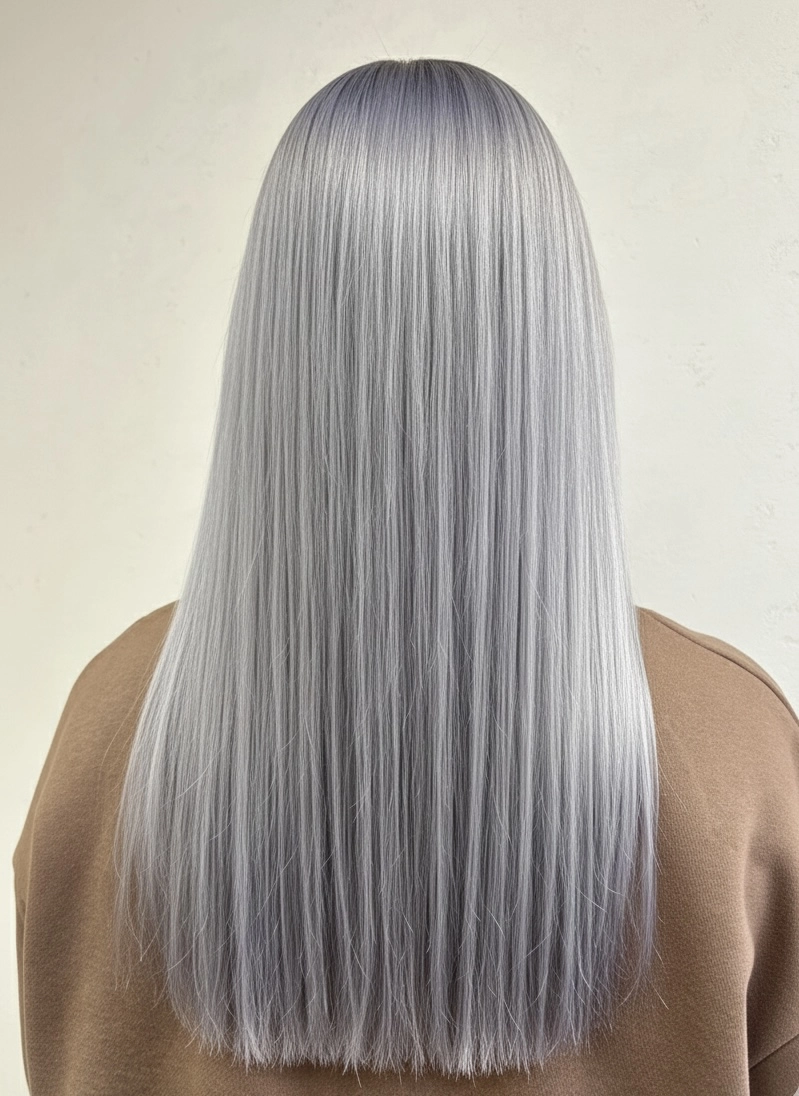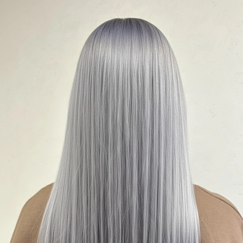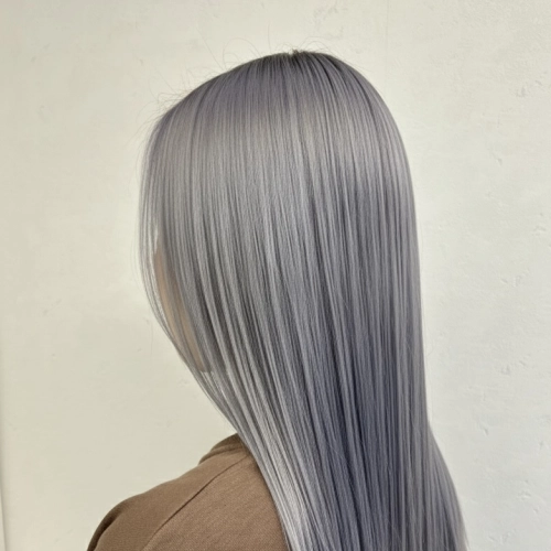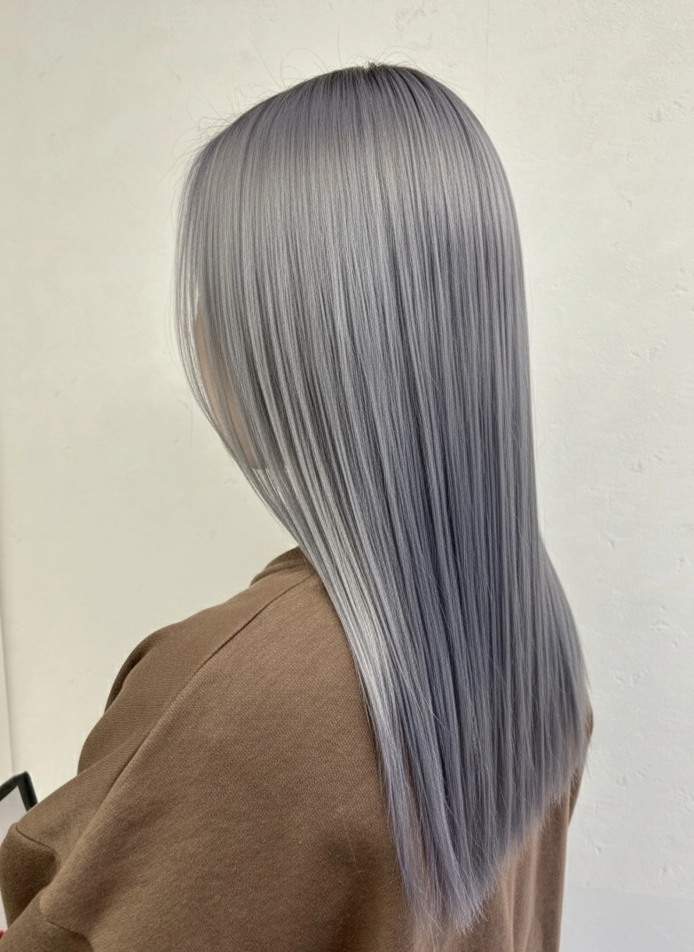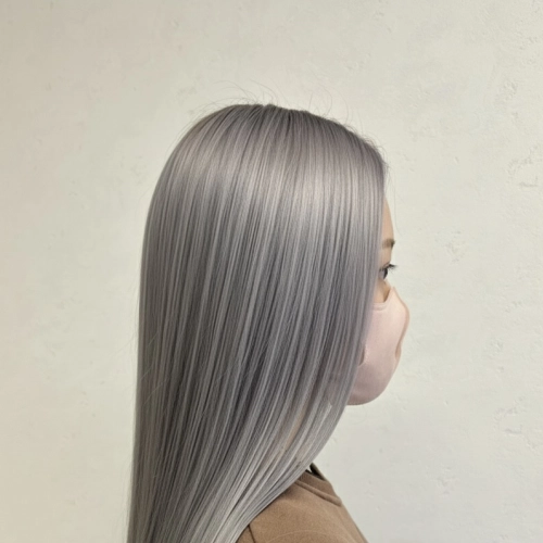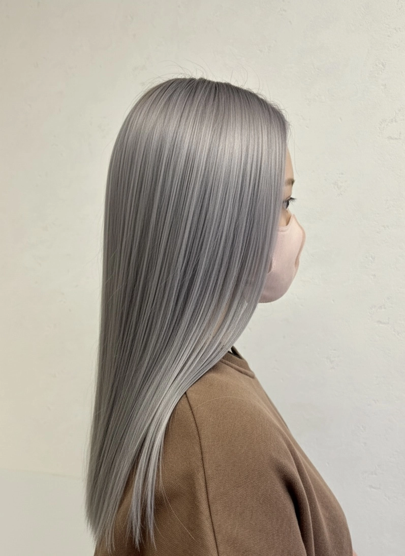 ブリーチベースを活かした透明感抜群のシルバーグレージュ。光に当たると柔らかいシルバーのニュアンスが出るので、重たく見えずおしゃれな印象になります。ストレート仕上げでツヤをしっかり出すことで、カラーの透明感と質感を最大限に引き立てています。