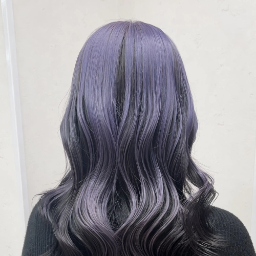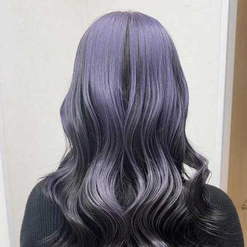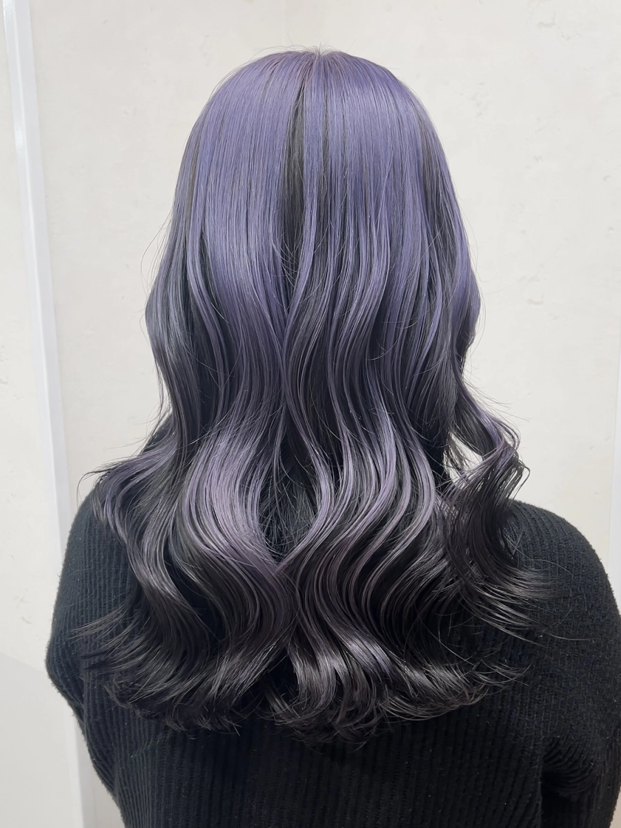 アンブレラカラーの表面はブリーチ2回でペールトーンのパープルで、下のベースカラーはシンプルに透明感あるブラックにしてみました♪下のカラーを暗めにすることでより表面の色味をしっかり引き立てくれます!