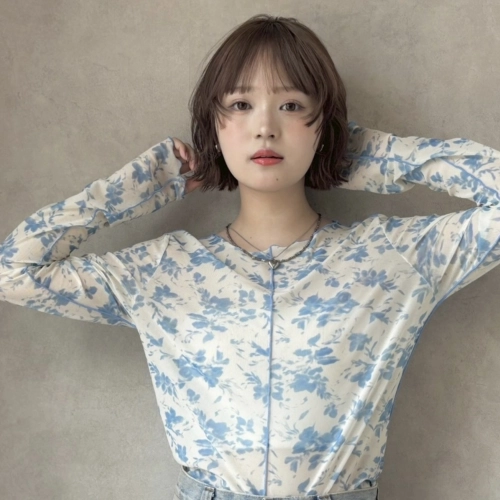 毛先の外ハネでこなれ感をプラスしたショートボブスタイル。顔まわりにはニュアンスを効かせて、小顔効果も◎。全体は丸みを残して、女性らしい柔らかさと上品さを両立。カラーは赤みを抑えたベージュ系で、透明感たっぷりに仕上げました♪
