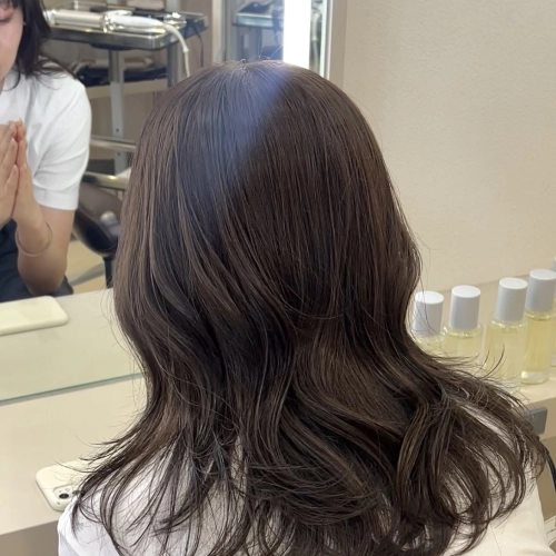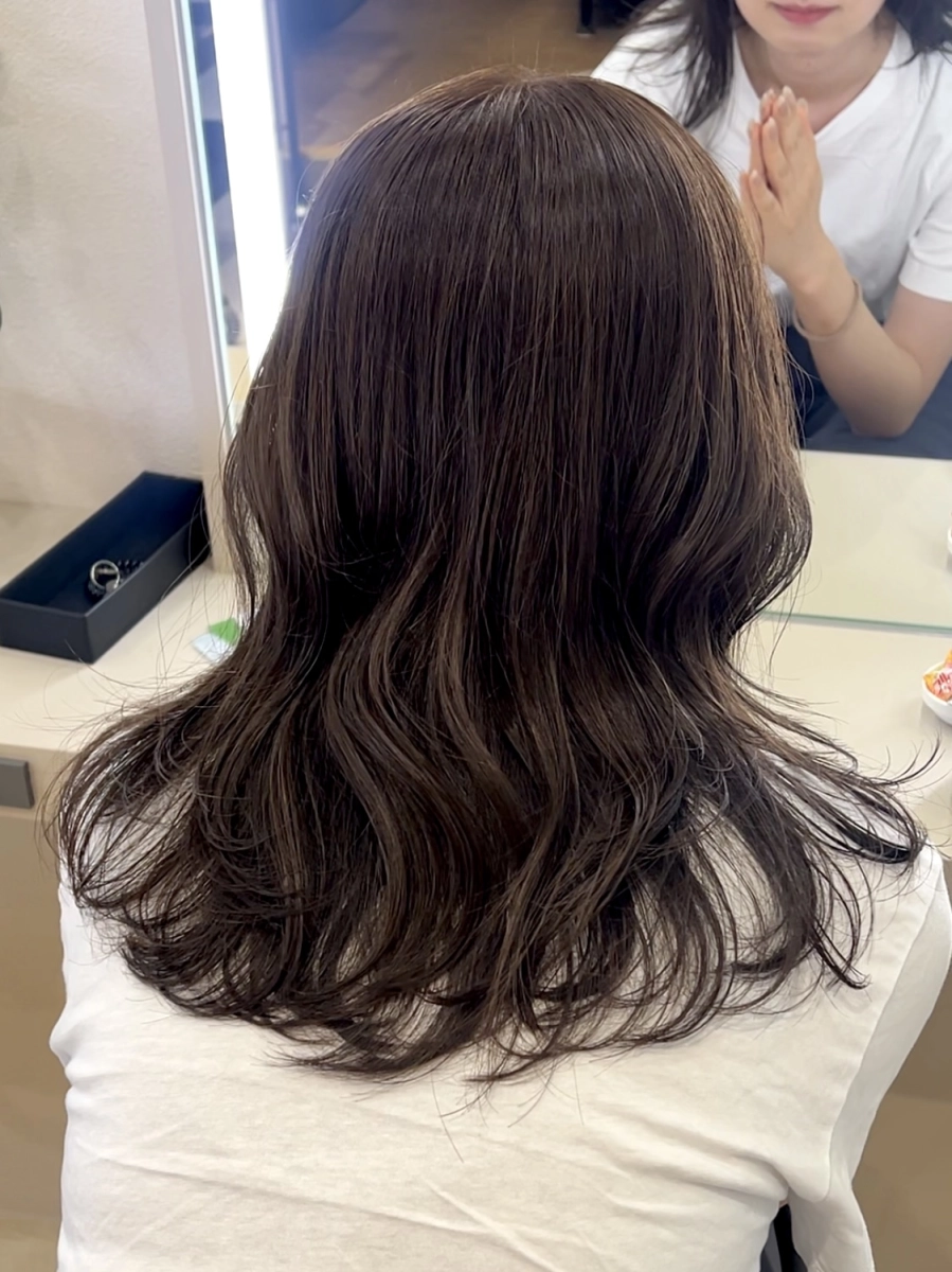 スタイリングは32mmのコテでリバースにゆるっとワンカール!内巻きストレートももちろんかわいいです!湘南台ブリーチなしカラー/湘南台レイヤー/レイヤーカット/アッシュブラウン/アッシュカラー/透明感カラー/ブリーチなしダブルカラー |